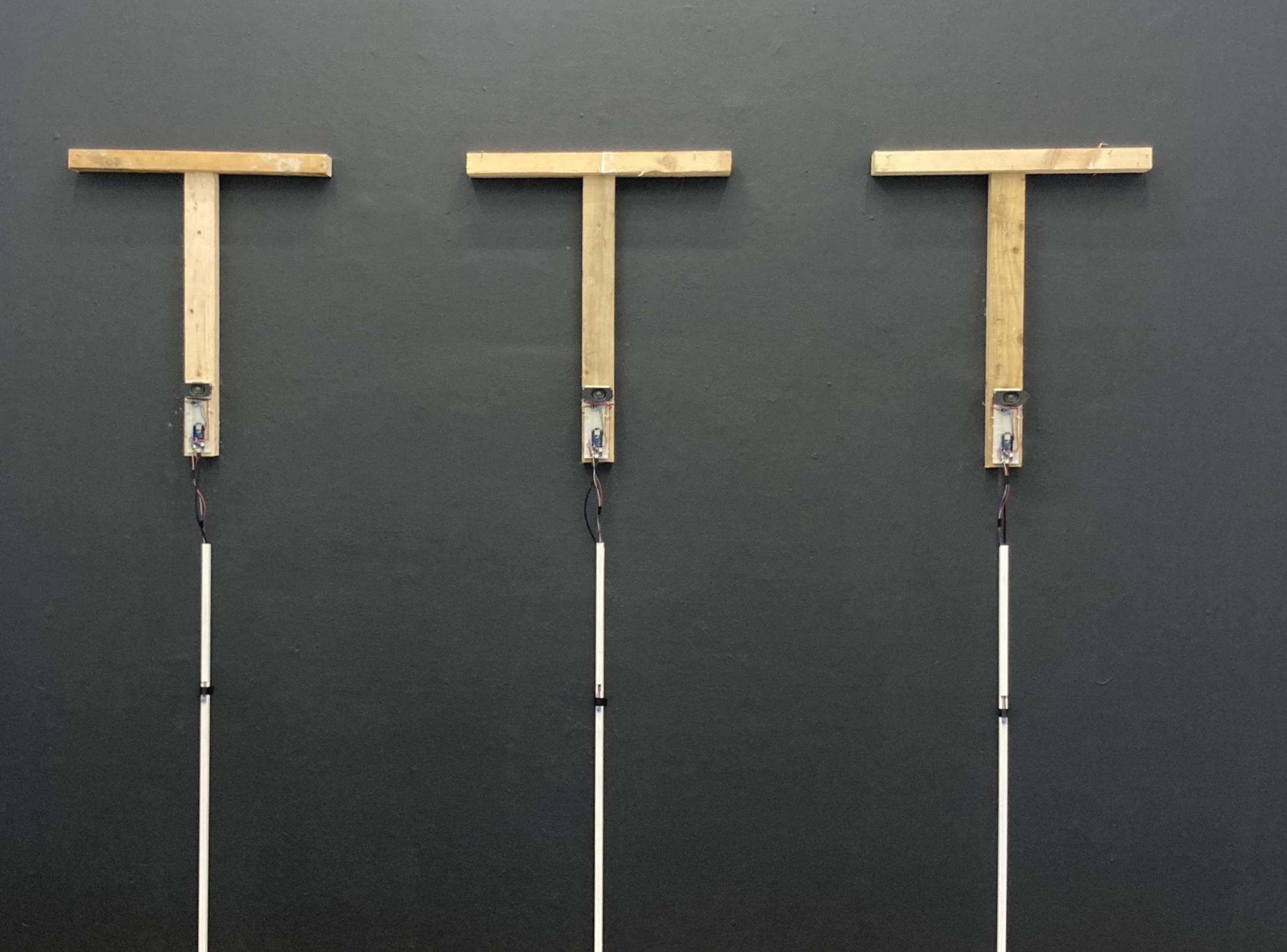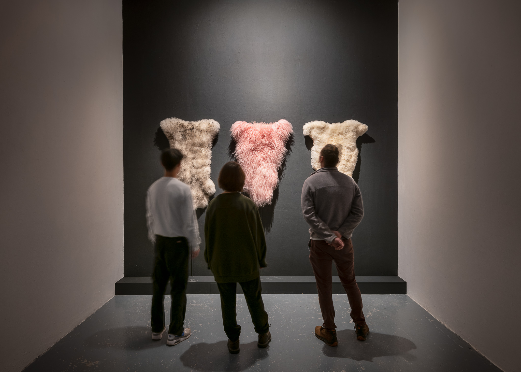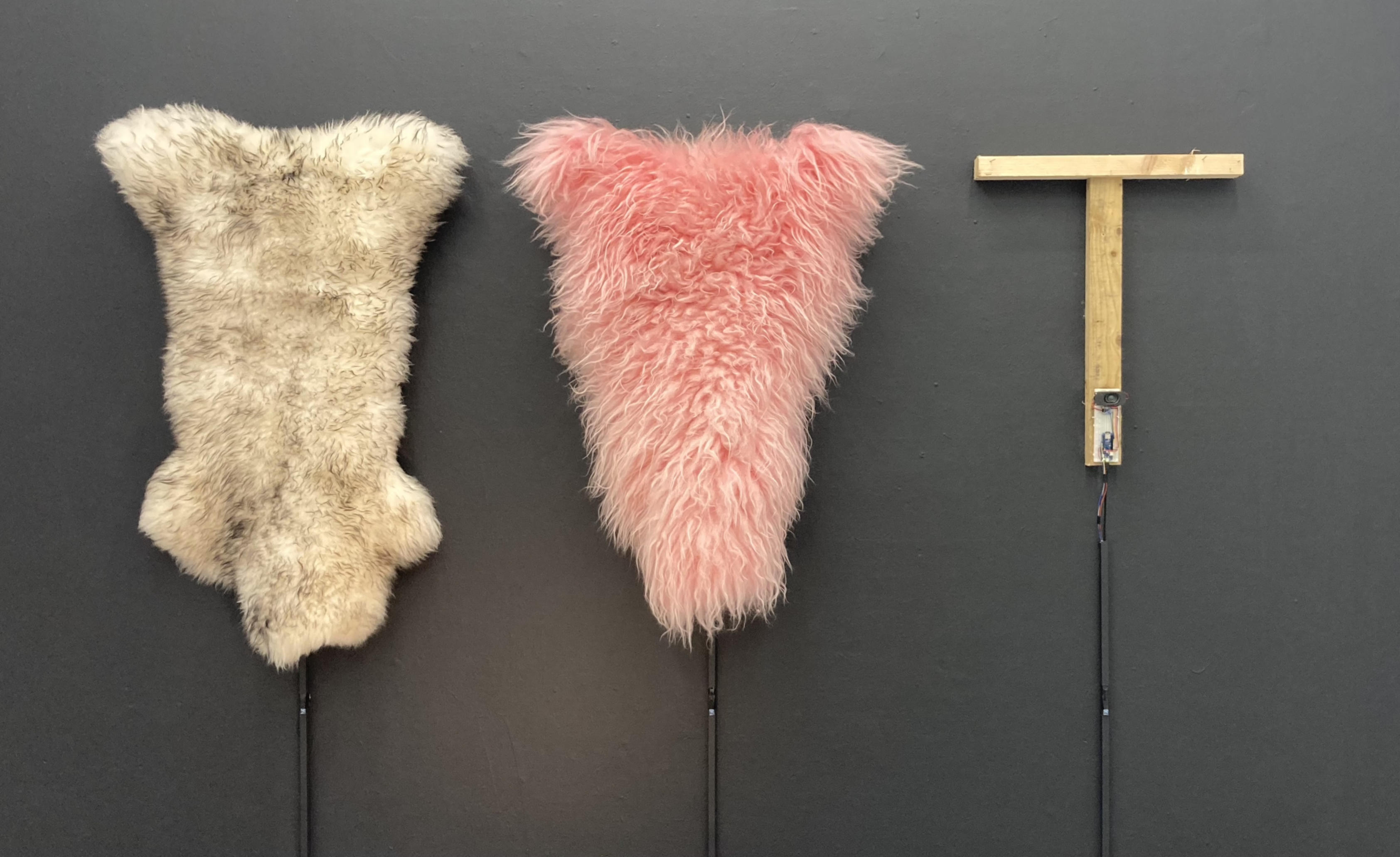 3 ‘Time of Flight’ motion sensors were employed to play a poem and other recorded sounds when the audience came into close proximity with hung sheepskins.